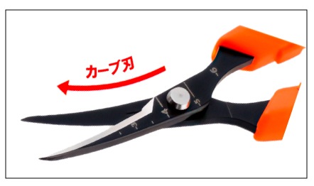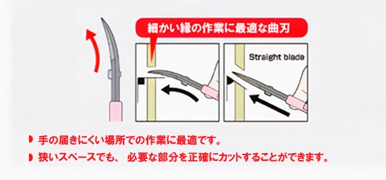 絶妙なカーブ(Curved Blade): 刃先が曲がっていることで、手元を隠さずに切りたい箇所を確認しながら作業が出来ます。